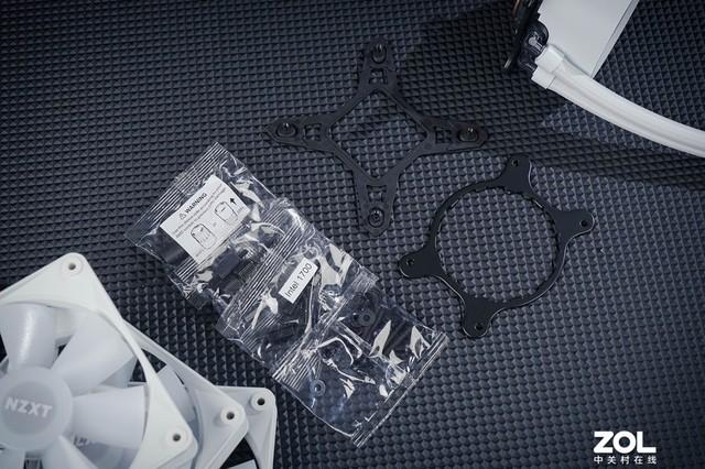 这款360mm一体式水冷散热器,支持Intel 1170/115x和AMD AM5/4全平台,盒中的五金配件包括可调式Intel平台背板、AMD平台的扣具,以及水冷头和散热风扇的固定螺丝、螺母。