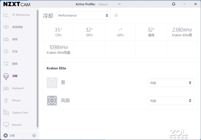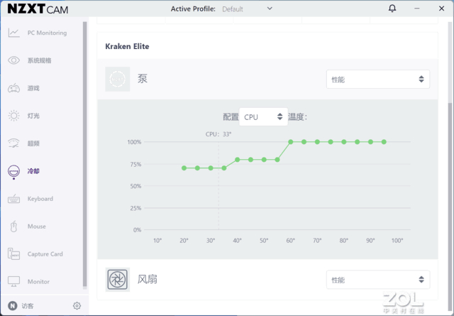 为了让水冷能发挥最佳效能,需要再NZXT CAM中的“冷却”选项里,将水泵和风扇的转速都设置为性能。