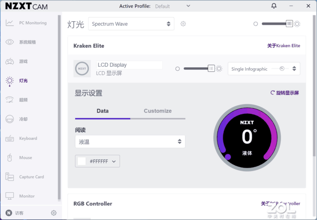 KRAKEN(海妖)ELITE RGB散热器水冷头的LCD屏幕可以当做机箱的副屏,在NZXT CAM中可以设定显示的信息,例如冷却液温度、CPU温度、CPU频率等,也可以同时显示CPU和GPU的信息。同时,还可以修改屏幕显示的方向以适应不同的机箱。