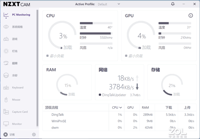 在视觉方面,虽然NZXT恩杰的散热器产品基本不参与主板的灯光控制,但效果却比主板灯效更加炫酷。这些我们都可以在配套软件NZXT CAM中进行设置。当然NZXT CAM也是个功能强大的监控软件,例如在PC Monitoring中可以查看CPU、GPU、内存的负载,以及网速、存储设备的容量以及高占用的线程等。