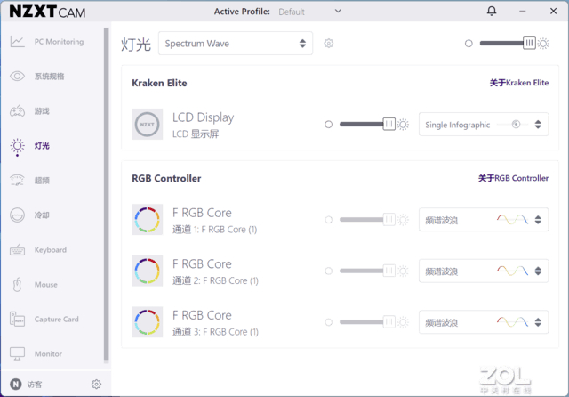 不过NZXT CAM最吸引人的地方,就是对于散热器视觉效果的自定义。在灯光控制中,既可以设置单个风扇的颜色和效果,也可以三个风扇整齐划一,同时还提供了诸如波形、呼吸、彩虹等灯效,在自定义场景中还可以设定每个风扇的亮度。