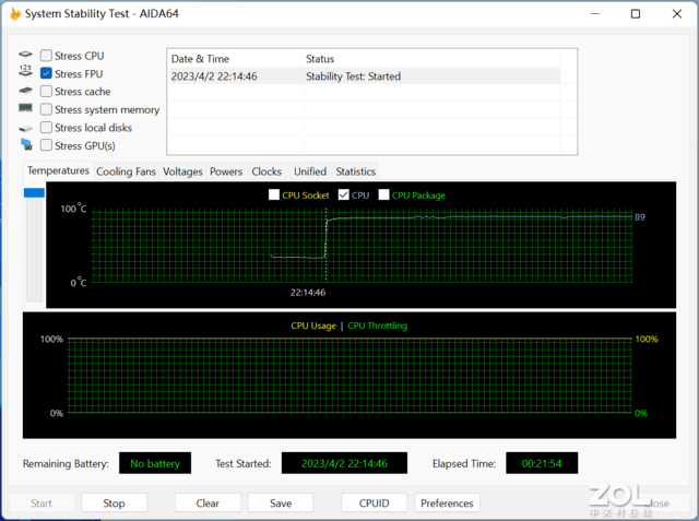 接下来开始运行AIDA64的FPU测试,此时CPU已经满载运行。经过21分钟的烤机,CPU满载时温度基本恒定在88摄氏度,水冷头的水温此时仅为32℃。由于FPU测试对于处理器的压力远大于各类3A游戏三维建模软件,因此NZXT恩杰KRAKEN(海妖)ELITE RGB应对13900K这款高性能CPU还是比较从容的。