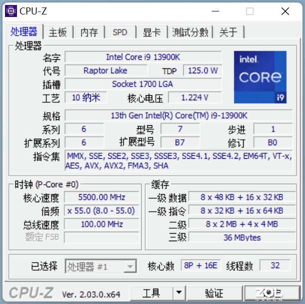 作为一款顶级水冷散热器,自然要安排上顶级的CPU。本次测试我们使用Intel酷睿i9 13900K+Z790主板。酷睿i9 13900K基于Raptor Lake架构,采用intel7制造工艺和混合架构设计,拥有8个性能核+16个效能核,共计24核芯32线程,TDP为125W。在BIOS中我们开启了全核睿频和超线程,此时CPU大核频率稳定在5.5GHz,小核频率稳定在4.3GHz。