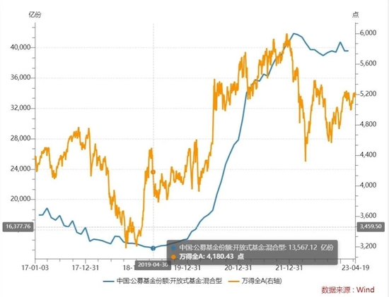 3、2019年的行情有三次大级别上涨:1-4月,6-9月,12月。尤其值得注意的是1-4月,那时也是TMT主导(但是没有移动互联网或者AI这样的强主线),指数涨幅是三轮里最大,但是我们可以明显看到公募混合型份额反而是相应快速减少的——尤其是万得全A涨到2018年年初位置让一大批人解套以后;