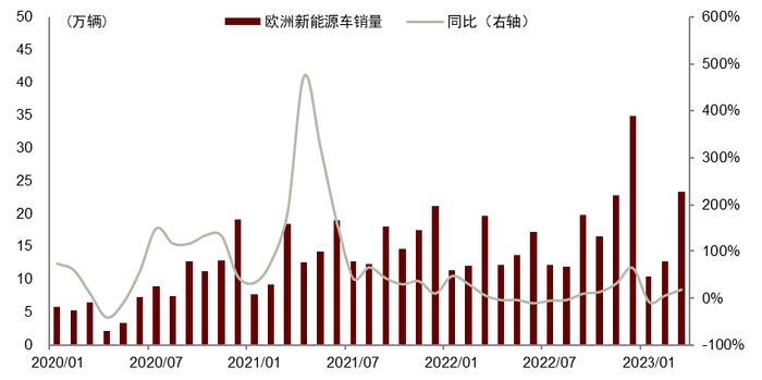 图表8:欧洲新能源汽车销量及同比增速