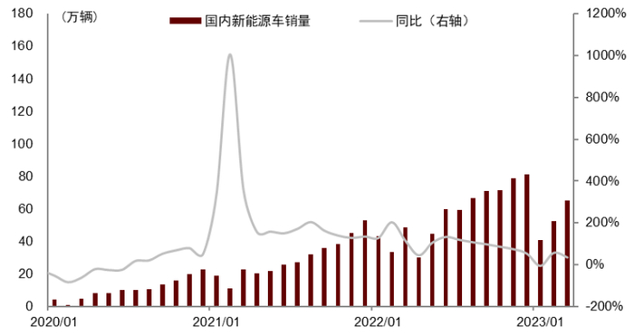 图表7:国内新能源汽车销量及同比增速