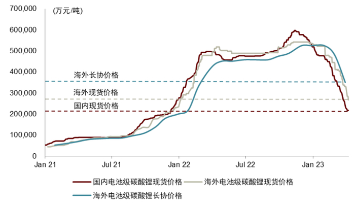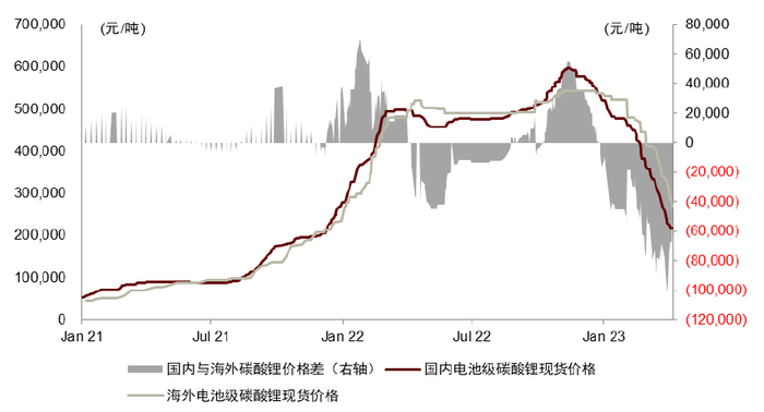 2022年11月至今,在下游产业链库存调整并呈现出较强的自我强化效应的背景下,锂盐价格经历了筑顶后的加速下跌,以国内电池级碳酸锂现货价格为锚,截至2023年4月17日,碳酸锂价格已经从前期高点的59.8万元/吨下跌至19.3万元/吨,期间跌幅达到69%。我们认为,当前时点应该重视跌价过程中的四点结构性变化,价格下跌同时对于行业的供给、需求、库存产生影响,或预示着碳酸锂价格下跌的趋势难以持续,短期随着冶炼厂库存的消耗锂价有望逐步企稳甚至可能出现反弹。值得注意的是,国内锂盐价格的加速下行导致中外锂盐产品价格体系出现历史性的割裂,当前海外的锂盐价格大幅高于国内,或蕴含着行业的结构性机会。