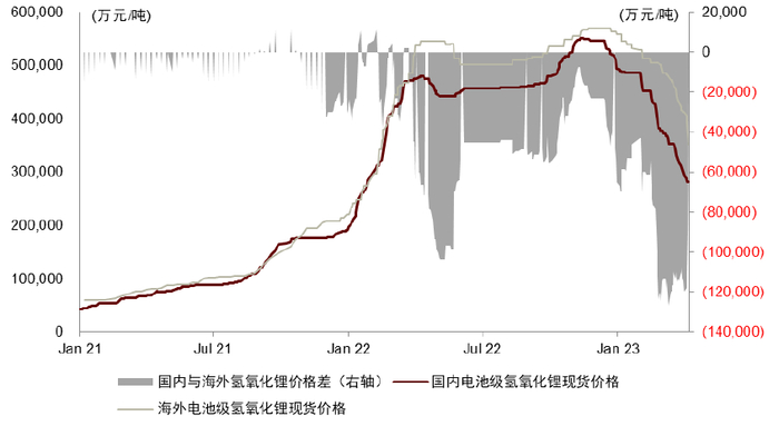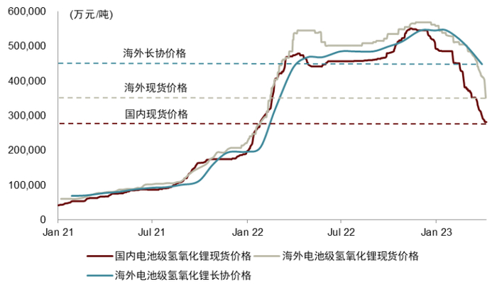 全球锂盐价格体系出现历史性的割裂。在国内锂盐现货价格的加速下跌的背景下,全球锂盐价格体系出现较大程度的割裂,主要体现为三点,一是氢氧化锂价格大幅高于碳酸锂,根据亚洲金属网,截至4月7日国内氢氧化锂现货价格为28.3万元/吨,相比国内碳酸锂现货价格高出6.5万元/吨,二是海外锂盐现货价格大幅高于国内,根据Fastmarket,截至4月7日海外电池级碳酸锂的现货价格折人民币约26.8万元/吨,相比国内电池级碳酸锂现货价格高出5.1万元/吨,海外电池级氢氧化锂的现货价格折人民币约35.2万元/吨,相比国内电池级氢氧化锂的价格高出7.0万元/吨。三是海外长协价格大幅高于现货价格,根据Fastmarket,截至4月7日海外碳酸锂的长协价格为35.2万元/吨,相比海外碳酸锂的现货价格高出8.4万元/吨,海外氢氧化锂的长协价格为44.9万元/吨,相比海外氢氧化锂的现货价格高出9.7万元/吨。