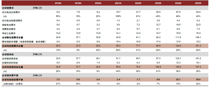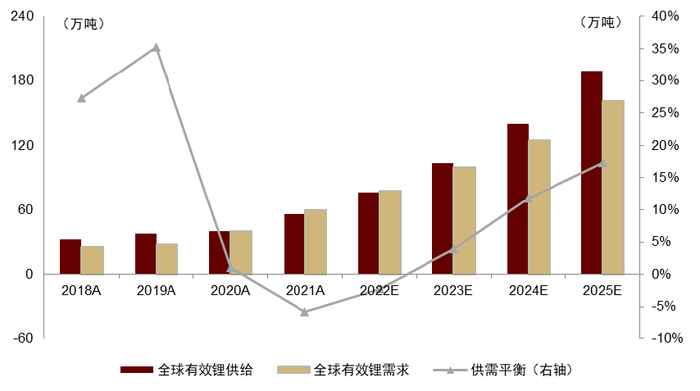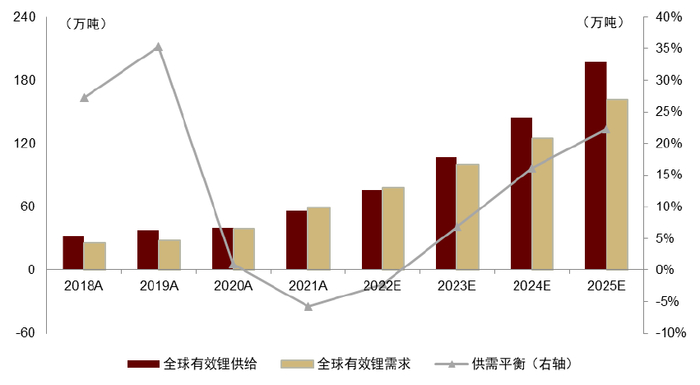 图表23:全球锂供需平衡(2018-2025E)