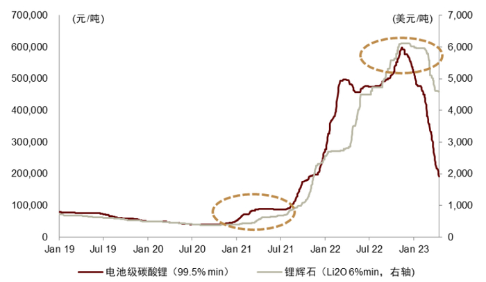 图表5:锂精矿的现货价格趋势相比碳酸锂价格滞后