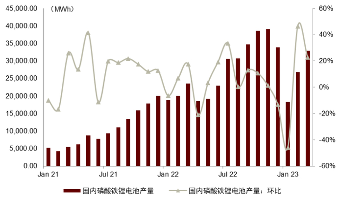 图表13:国内磷酸铁锂电池产量及环比