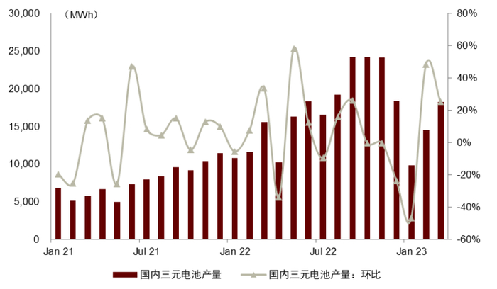 图表14:国内三元电池产量及环比