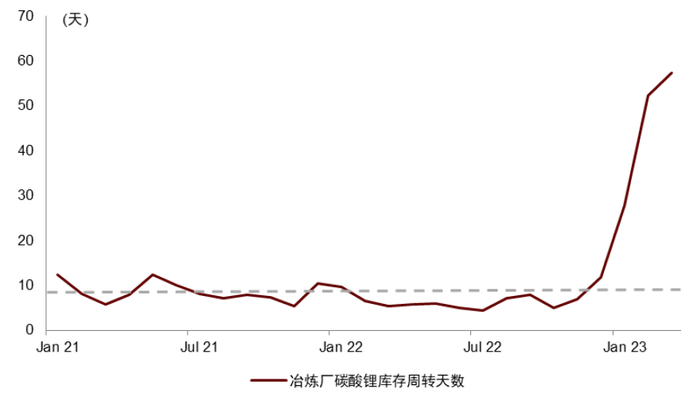 锂盐冶炼厂的库存仍处于较高水平,应该关注库存消耗的节奏。2022年11月至今,在锂盐市场供过于求的背景下,国内锂盐冶炼厂的库存逐步累积,中国青海的盐湖提锂企业、四川和江西的锂辉石冶炼厂、江西宜春的云母提锂企业均有不同程度的累库现象,根据SMM,国内锂盐冶炼厂2月的碳酸锂库存约6.7万吨,对应约2个月的国内锂盐产量,从历史数据看,2021年至今国内冶炼厂碳酸锂库存的平均周转天数约12天。我们认为,锂盐厂积累的库存在短期将对市场形成抛售的压力,或将导致短期锂价仍有进一步下行的可能性。锂盐冶炼厂的高库存已经引起供给侧的收缩,我们认为在未来下游需求有望逐步恢复的背景下,冶炼厂库存的去化将是大势所趋,随着库存的消耗锂盐价格有望逐步企稳,甚至出现反弹,应该关注锂盐厂库存消耗的节奏。