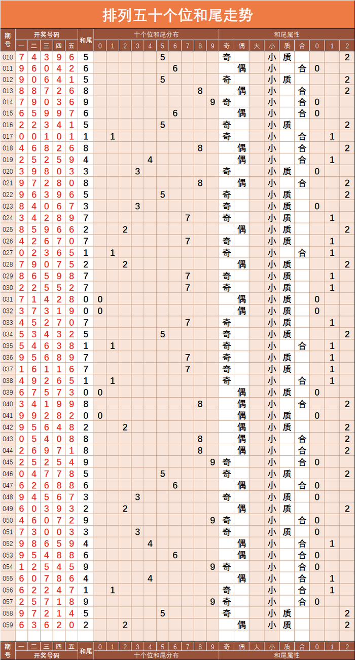 合理搭配冷热码,能有效提升排列五选号准确率。俗话说,强号恒强,弱号恒弱,这在排列五选号中依然是不可放弃的原则。但要注意的是,每期开出的奖号不可能全是前期热出的号码,所以还应特别留意冷号的弹出;因为任何一个前期的冷号不可能永远成为冷号,它只不过是某个期段中的偏冷之号,很可能在下个期段中,冷热号就会进行转换,前期冷号很可能成为未来几期中的热号,前期相对较热的号码也有可能在今后几期中走冷。因此,在选号时应选择少量的温号及冷号作为选号时的候补备选号码;最佳的号码组合应该是遵循热号为主、温号为辅、冷号为佐这样的原则。总的来说,要想利用号码的冷热性,通过统计分析一些数据,如热号历史冷热轨迹,冷号的最大平均周期等等来确定号码冷热温转换的具体临界点或者临界段,是彩民利用冷热性选号时最有效、最直接的方法。