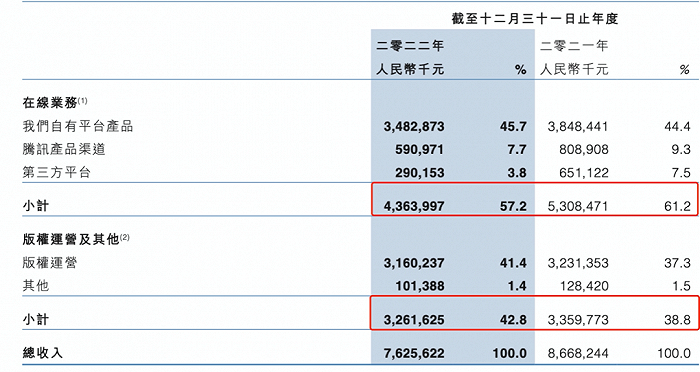 而从营收构成来看,在总营收占比57.2%的“在线业务”去年实现收入43.64亿元,同比减少17.8%,2021年同期这部分收入为53.08亿元,比2022多出近10个亿;而剩下42.8%的“版权运营及其他”收入也同比减少2.9%,为阅文带来32.62亿元的,低于2021年的营收。