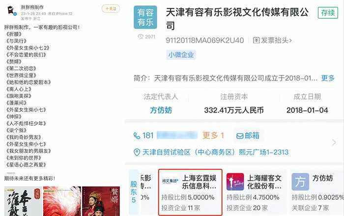 另外一家阅文投资2250万元的公司名为天津有容有乐影视文化传媒有限公司,企查查显示该公司成立于2018年,经营范围包括电影摄制、发行、广播电视节目制作、动漫设计、影视策划等等。除了阅文目前在该公司持股5%,国内知名影视公司耀客传媒(上海耀客文化股份有限公司)也持有该公司4.75%的股份。耀客传媒曾开发制作了《神话》《金枝玉叶》《心术》等影视作品。