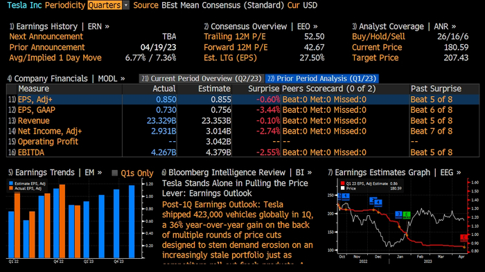 特斯拉4月19日盘后发布2023年第1季度财报,财报显示,特斯拉今年一季度营收233.3亿美元,同比增24%,略低于彭博分析师一致预期的233.5亿美元。调整后每股收益EPS为0.85美元,同比跌21%,略低于彭博分析师一致预期的0.855美元。$特斯拉(TSLA)$