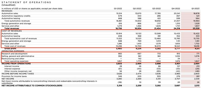 造成本次营收下滑的主要原因是汽车销售收入的环比下降,这次的数据基本算是符合我之前的预期,交付数据是明牌,早在月初,特斯拉就已公布1季度的交付数据,特斯拉2023年第1季度交付422,875辆车,同比增长36%;其中,Model S/X交付10,695辆,同比下降27%;Model 3/Y交付412,180辆,同比增长40%。