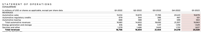 分业务来看,核心的汽车业务收入在一季度达到199.6亿美元,同比增18%、环比跌超6%;能源业务收入15.29亿美元,同比上涨148%,环比上升17%;服务及其他业务收入为18.37亿美元,同比上升44%,环比上升8%。