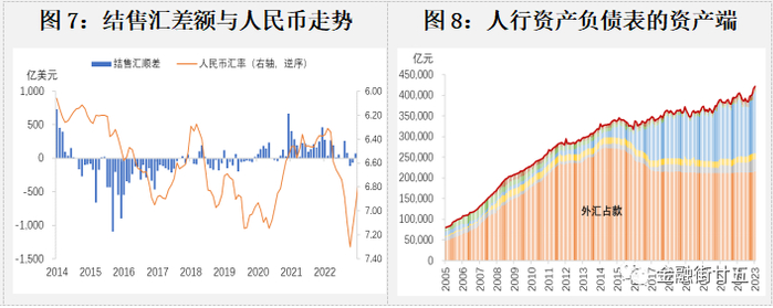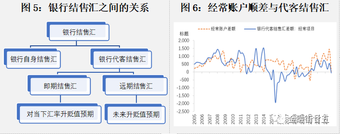 从资金链条中可以看出,与货币需求最直接相关的人为因素是银行代客结售汇。自从我国取消强制结汇政策后,企业客户在收到外汇后可以根据自己的意愿选择是否结汇,或自主选择结汇时间,企业行为直接反映了市场对人民币汇率升贬的预期。于是我们可以明显观察到经常项目项下的结售汇顺差常常低于同期经常账户差额,可以简单地理解为持币待结或“藏汇于民”;但在人民币贬值动能较大时(如2015-2016年),购汇需求十分旺盛,甚至与经常账户差额高度分化。
