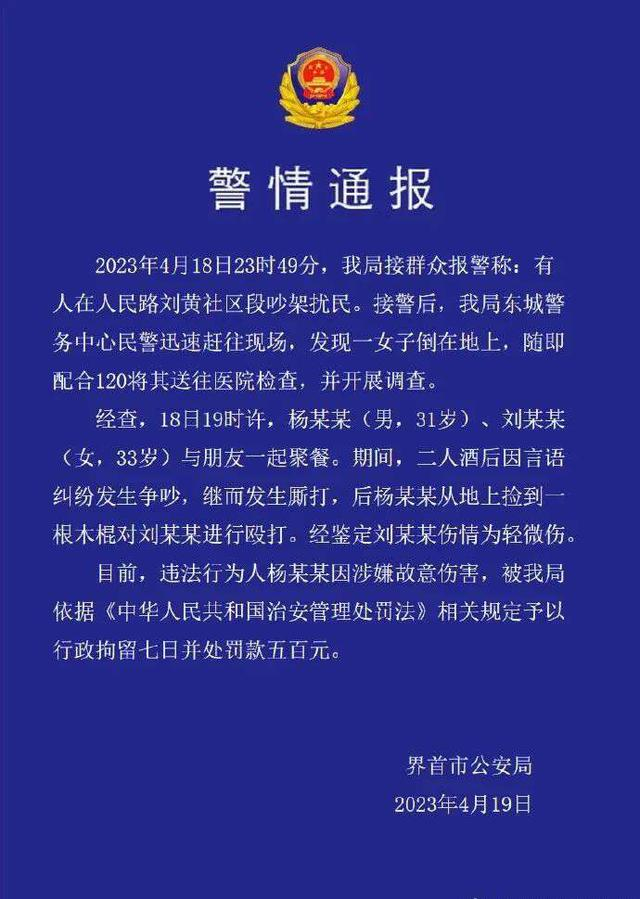 经查,18日19时许,杨某某(男,31岁)、刘某某(女,33岁)与朋友一起聚餐。期间,二人酒后因言语纠纷发生争吵,继而发生厮打,后杨某某从地上捡到一根木棍对刘某某进行殴打。经鉴定刘某某伤情为轻微伤。