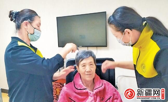 南湖南路街道综合养老服务中心,护理员为老人梳头发。