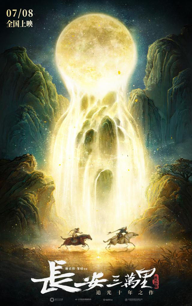 追光动画十周年钜献作品《长安三万里》今(20)日正式定档7月8日,“月落九天”版定档海报同步曝光:明月高悬,飞瀑流泉,高适、李白策马逐风,共赴万里人生,勾勒传递出诗意大唐的浪漫与恢弘。