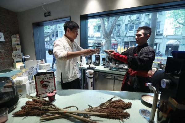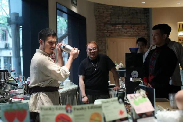 上海有近8000家咖啡馆,数量全球第一,如果你最近恰好走进陕西南路上的明谦咖啡,可以喝到店长齐轩研发的新品“红妆”,还有可能偶遇话剧《红高粱家族》的演员,穿着红高粱酒坊掌柜、伙计的戏服,为你调一杯特别“上头”的咖啡。