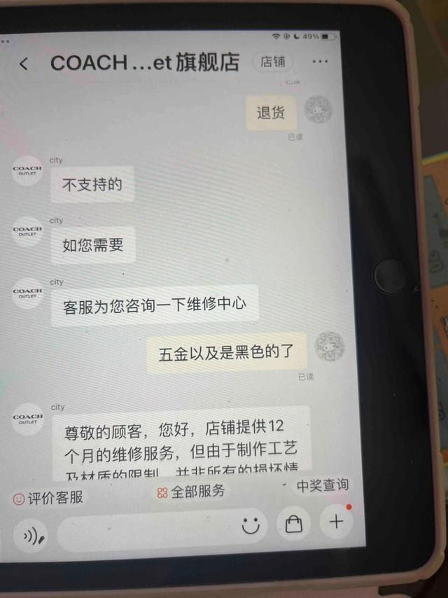 王女士称,4月7日她曾向商家反映五金发黑,但对方客服回复,蔻驰有关商品在出库前会严格检查及仔细包装,可以确保全新出库,因此不支持退换,也未提供解决方案。随后她找到淘宝,但客服以“过了售后期”为由,未有效处理相关诉求。