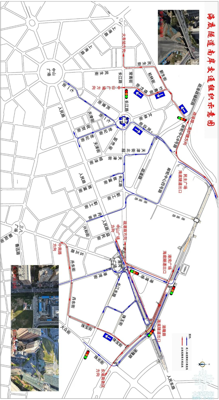 ◆ 中山广场周边:海底隧道民主广场出口-港汇街西段-新生街-竹青街-修竹街-民意街;海底隧道民主广场出口-港汇街西段-新生街-民生街-长江路;