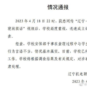 近日,一条“辽宁一职校教师查寝放狠话”视频在网络流传。视频中,一名男老师查寝时与学生发生口角,指着一名学生说道“我查寝你就老老实实的配合,明不明白?”,又指向在场的学生问“哪个不服啊?”4月19日,涉事学校辽宁机电职业技术学院发布情况通报,称学校安保部干事在查寝过程中与学生发生争执,行为言语不当,情况基本属实。目前,学校已停止涉事人员工作。