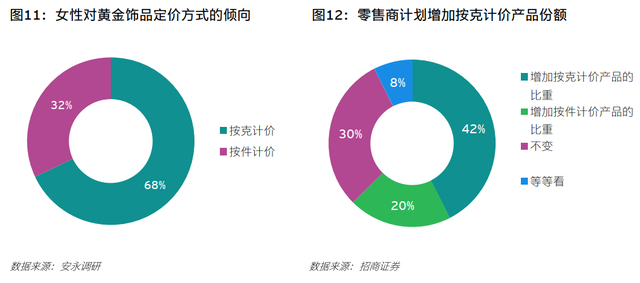 同时,根据安永调研数据显示(图10),有57%的女性更关注珠宝首饰的保值能力,39%的女性更关注价格。这一特点也解释了女性对于素金饰品更为青睐的原因,黄金饰品具备“投资+消费”双重属性,在地缘政治形势动荡、全球经济形势低迷以及各国货币政策进一步宽松的背景下,黄金的投资避险属性凸显。在当今黄金价格不断走高的情况下,女性会更加青睐于保值且回收变现能力强的素金饰品。根据安永调研数据显示(图11),在选择黄金饰品时,68%的女性更倾向于选择按克计价产品,32%的女性愿意选择按件计价产品。相较于设计、IP、品牌所带来的溢价,一部分消费群体会选择购买最为“简约朴素”的黄金饰品,例如近几个月在年轻女性中流行的爆品“小金条”“小金豆”,通过购买此类产品,既满足了购物心理需求,⼜兼具了投资理财的属性。根据世界黄金协会数据,43%的零售商计划增加按克计价产品份额[18]。