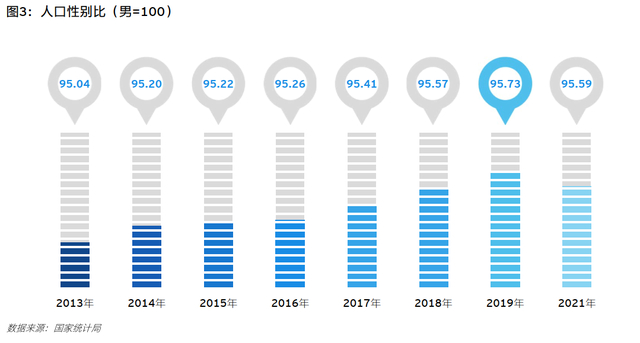 2022年,我国人口总量略有下降,城镇人口保持增长,城镇化质量稳步提高:根据国家统计局数据显示,2022年人口出生率6.77‰,人口死亡率7.37‰,人口自然增长率为负0.60‰[10]。从性别构成看,2022年年末男性人口72,206万人[10],女性人口68,969万人[10],总人口性别比为95.52(以男性为100)。根据统计局数据可以发现(图3),近几年来,人口性别比总体呈现上升趋势,女性占比缓慢升高,男女比例趋于均衡,2021年中国男性人口从1978年以来首次出现下降,2022年男性人口加速减少,而女性人口则继续增加。
