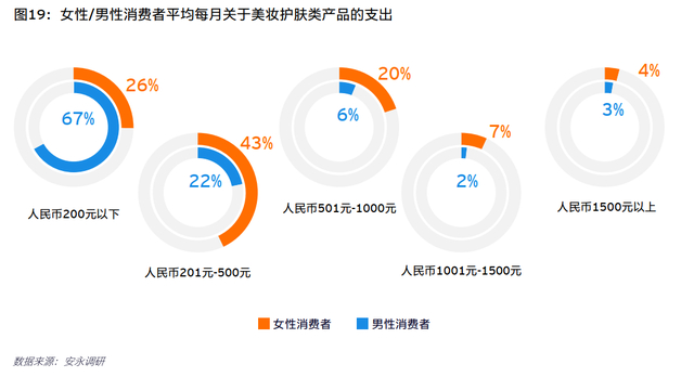 近年来,众多资深化妆品品牌已经开设了专属于男⼠的产品线,一些专为男性群体而成立的新兴品牌也应运而生,“精致男孩”们掀起了一股“男颜经济”风潮。根据安永调研数据显示(图19),接近七成的男性受访者每月在美妆护肤类的消费投入少于人民币200元,而在这一消费区间的女性受访者仅有四分之一,接近半数的女性受访者每月在美妆护肤的消费投入在人民币200元至人民币500元之间,而消费区间在人民币1,000元以上的女性受访者也在一成左右。由此可见,尽管近年“男颜经济”话题热度上升,但是男性消费者在化妆护肤这一品类的消费选择,没有呈现与女性消费者一样的狂热,美妆护肤市场的主流消费者依然以女性为主,甚至在男性理容产品的消费中,由女性消费者礼赠或代为购买的消费场景也是非常常见的。对比珠宝首饰和奢侈品购物,美妆护肤类产品的售价范围空间差异比例更大,消费者可选择的空间更多更广。