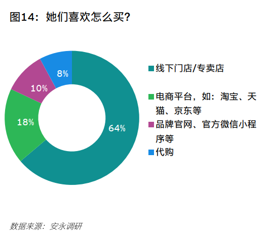 线下线上齐驱并进,“包”治百病永不过时。随着全球数字经济的发展,消费者获取奢侈品信息的渠道更加多样化,不再局限于传统广告,移动网络的发展让消费者可以随时随地在社交媒体平台刷看博主或明星推荐,再去线下实体店选购。根据安永调研数据显示(图14),64%的女性受访者仍然选择线下门店或者专柜作为购买奢侈品的主阵地。她们认为这不仅仅是在购买一件产品,同时也是在享受高质服务带来的额外精神享受,还能满足她们在社交媒体上分享拥有奢侈品的愉悦。同时,根据安永调研数据显示(图14),28%的女性受访者也愿意通过电商平台、品牌官网或者官方小程序购买奢侈品,受消费者行为改变与互联网技术普及的影响,近年来越来越多的品牌方纷纷布署自有数字化营销系统,不仅推出AR试戴试穿等各种数字体验引导线上消费者实现线下体验,还解决了线下门店面积及商品展示的局限,以更接地气的方式对话年轻消费群体,打开线上消费渠道的大门。