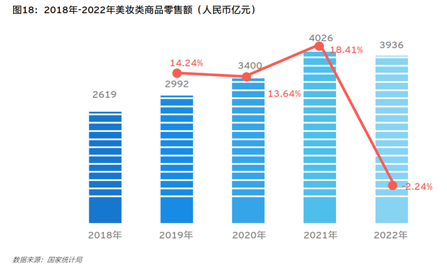 2020年至2022年三年期间,长时间的居家隔离,出门需要佩戴口罩、减少不必要的社交活动,这一系列的连锁反应都使得美妆护肤行业遭受到巨大的冲击,需求端呈现疲弱趋势。从统计数据可以看到(图18),美妆护肤类的商品销售额自2018年至2021年,销售额呈现逐年增长的趋势,然而自2022年开始相较于2021年销售额有所下降,增速略有放缓。由广东省化妆品学会、珠海市大美湾化妆品创新研究院联合组织编写,近两百位行业专家匠心打造的《化妆品产业蓝皮书:中国化妆品产业研究报告(2022)》指出,中国化妆品市场规模预计2025年将达到人民币5,400亿元,得益于消费升级和中国化妆品消费人群基数大,届时中国将成为全球第一大化妆品市场。