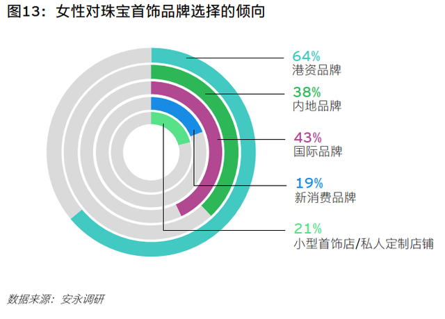 除设计和价格之外,品牌也是影响消费决策的关键因素,34%的女性选择了这一选项。品牌声誉上,呈现出国货崛起的趋势,根据安永调研数据显示(图13),64%的女性消费者选择⽼牌港资珠宝品牌,43%的女性消费者倾向于选择国际品牌,38%倾向于选择内地珠宝品牌以及19%倾向于新跃起的消费品牌。国货品牌的崛起是渠道、产品体系、研发设计、市场营销多方面共同作用下的成果,也与“国潮”兴起、文化自信等因素密不可分。