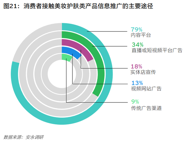 然而,根据安永调研数据显示(图21),尽管网上及免税相关购物等已经成为了消费者的主要购买途径,近八成的受访者表示在他们接触有关产品的推广时更多地是依赖内容分享平台的推介。在内容分享平台上,每个消费者可以发表自已对产品的使用感受,他们也非常依赖社交媒体KOL分享的信息以作为自已的购物参考。消费者对品牌和产品的认识以及消费行为的习惯受到社交媒体平台的影响,“种草”和“拔草”是消费者决定是否对产品进行消费的关键因素。