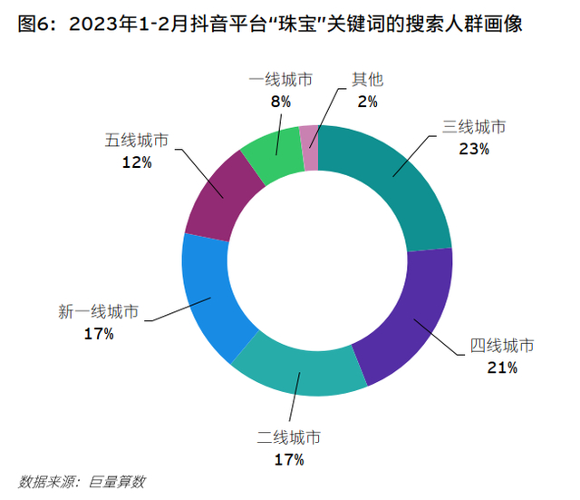 供给端,某珠宝行业头部品牌近些年逐步下沉,三四线城市新开门店数量不断增加,其下沉市场的策略取得巨大成效,下沉市场的巨大潜力得以体现。根据巨量算数数据,2023年1-2月,抖音平台“珠宝”关键词的搜索人群中,一线城市、新一线城市、二线城市占比合计42%,而三线城市到五线城市占比合计56%[16](图6)。(注:城市等级划分依据为巨量算数平台标准)