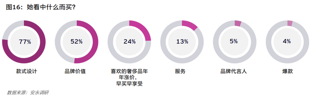 精致悦已稀缺珍贵,“她”的新兴消费态度。在“颜值经济”的刺激下,女性消费者对产品的审美需求不断提升,更加注重产品所展现的内涵和品味,也更愿意表达自已对美的理解,她们的消费态度强调精致、悦已、稀缺、珍贵,以此来追求“美”带来的赏心悦目和内心满足。在奢侈品的消费中,”悦已”是她们重要的消费态度,女性消费者通过深度体验美学内涵和品牌故事来找寻、提升和认可自我。根据安永调研数据显示(图16),77%的女性受访者认为有“颜值”的款式设计是她们购买奢侈品的首要考虑因素。不仅如此,奢侈品最动人的部分,除了独具匠心的款式设计,还有时间沉淀的品牌文化和价值,根据安永调研数据也显示有52%的女性受访者重视奢侈品背后的品牌价值,她们被精准而引人入胜的品牌故事吸引,认为承载着品牌历史和价值的经典款更能传达该品牌的文化,体现其珍贵和稀缺性。
