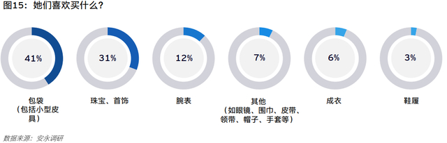 俗话说“包”治百病,“对于女性来说,没有什么事情是一个包解决不了的,如果有那就两个”,可见奢侈品牌的包袋对于女性来说,不仅是用来存放东西的单品,也起到装饰造型、提升品味、融入圈层的作用,而奢侈品牌的包袋更是将这个作用体现得淋漓尽致。根据安永调研数据显示(图15),约41%的女性受访者认为奢侈品牌的包袋识别度高,经典款实用性高且百搭,无论是背包、挎包、还是手提包,作为可以随身携带却不觉得累赘和刻意的饰品,在使用时总能处于全身最中心的位置,容易被别人关注,所以这是她们首选的奢侈品品类。