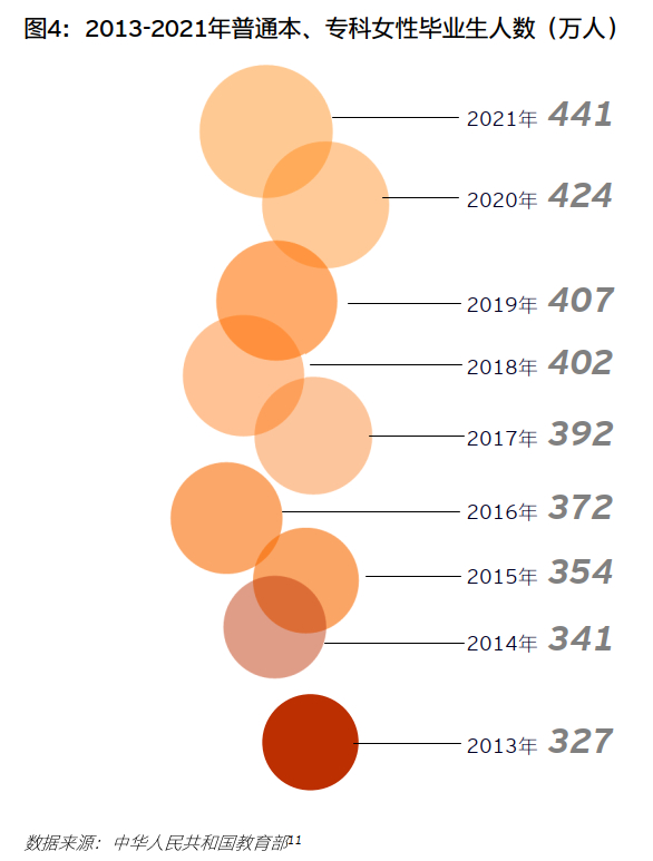 随着女性的经济、社会地位以及受教育程度(图4)的提高,女性在消费上拥有更多的话语权,“她经济”更是各大商家努力想要抓住的热点题材。女性消费者作为家庭中的非常重要的角色,“她们”是女儿,是妻子,是妈妈,“她们”掌握着家庭的主要日常消费,同时,“她们”更重要的角色也是自已。一系列围绕女性理财、消费而形成的特有经济圈和经济现象也由此诞生。