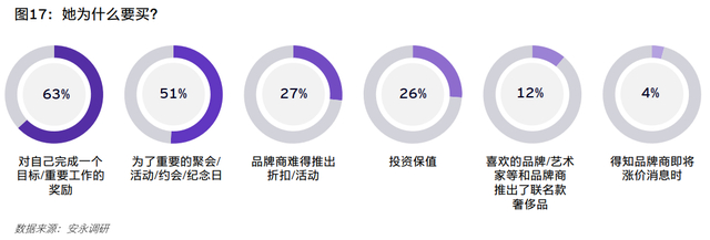 而在女性经济实力日益增强以及消费观念逐渐转变的今天,越来越多的女性消费者特别是年轻女性愿花敢买,促使她们购买奢侈品的场景也更加多样化。根据安永调研数据显示(图17),63%的女性受访者表示其愿意购买奢侈品作为对自已完成某项目标或工作的奖励,以此来奖励和取悦自已,同时,51%的受访者会为了重要的聚会、活动、约会或纪念日而购买奢侈品。