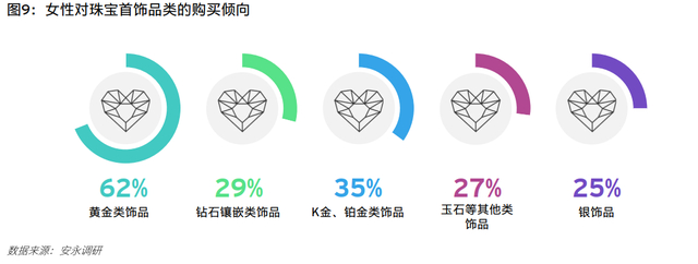 首先,品类上,女性对钻石镶嵌类产品的偏好有所下降,而素金类产品则越发流行。根据安永调研数据显示(图9),女性对品类倾向排名前三位的分别是黄金类饰品(千足金等纯金饰品),占比62%;K金、铂金类饰品,占比35%;钻石镶嵌类饰品,占比29%。近年来随着黄金饰品工艺的飞速革新以及“国潮”的兴起,3D、5G、硬金工艺以及“古法金”工艺丰富了黄金产品的品类,产品设计也更加契合年轻一代女性的审美。