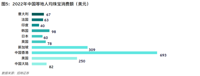 从城市等级维度来看珠宝首饰行业的消费情况,下沉市场展现出了较大潜力。需求端,随着国内经济的迅速发展、人均可支配收入的提升,下沉市场居民的巨大消费潜力有待被发掘,虽然2022年国内黄金珠宝市场规模达到了人民币8,159亿元的庞大规模,但2022年中国大陆人均珠宝消费仅为82美元,与美国及新加坡等地相比仍有较大增长潜力(图5)[15]。