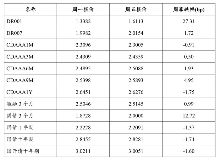 本期(4.10-4.14),市场资金整体合理充裕,资金价格涨跌不一。具体来看,银行间存款机构隔夜回购利率报1.6113,上涨27.31BP;DR007报收2.0154,上涨1.72BP。同业存单收盘到期收益率(AAA)1M、3M、6M、9M、1Y分别下行0.91BP、上行0.50BP、1.93BP和4.95BP、下行1.75BP。3个月短融和国债分别上行0.99BP和12.72BP。