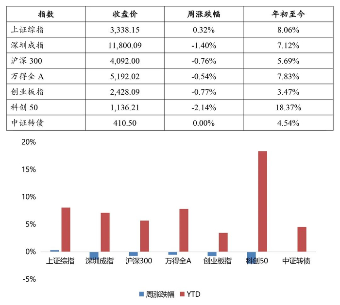 本期(4.10-4.14),上证指数连涨五周,报收3338.15点,创10个月新高。具体来看,上证综指报收于3338.15,上涨0.32%;深证成指报收于11800.09点,下跌1.40%;沪深300报收于4092.00点,下跌0.76%;创业板指报收2428.09点,下跌0.77%;中证转债指数报收于410.50点,上涨0.00%。
