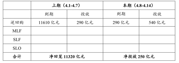 根据央行公告,本期累计开展公开市场逆回购操作540亿元,无MLF投放;本期共有290亿元逆回购到期,无MLF到期,共实现资金净投放250亿元。