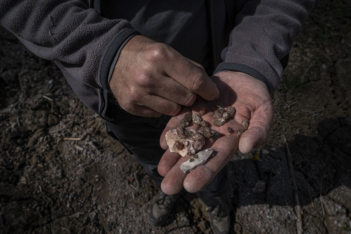 当地时间2023年4月7日,西班牙巴塞罗那以北100公里处的维拉诺瓦德索,在极端干旱条件下的萨乌(Sau)水库,一名男子展示干燥土壤的样本。