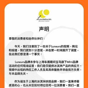 而事件所涉冰淇淋品牌@Luneurs 也在当日下午发布道歉声明称:未参与上海车展期间宝马旗下MINI品牌活动的任何现场运营,我们是仅提供冰淇淋产品的供应方。视频中出现的两位工作人员及其具体服务并非由我方负责,与本品牌无关。
